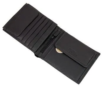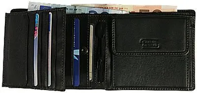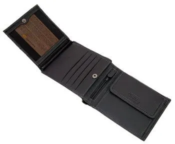 Portfel posiada dwie osobne kieszenie na banknoty, co pozwala wygodnie oddzielić różne waluty lub rachunki. Kieszeń na monety ułatwia przechowywanie bilonu, a dodatkowe kieszenie pozwalają schować paragony lub dokumenty.