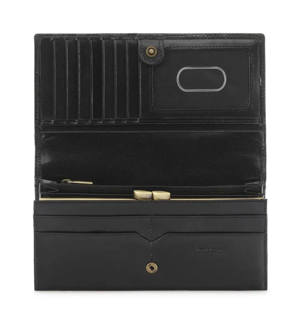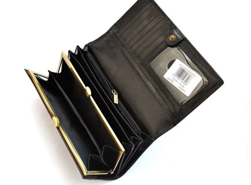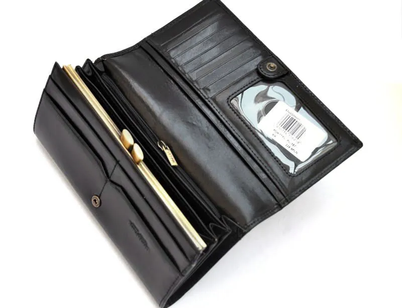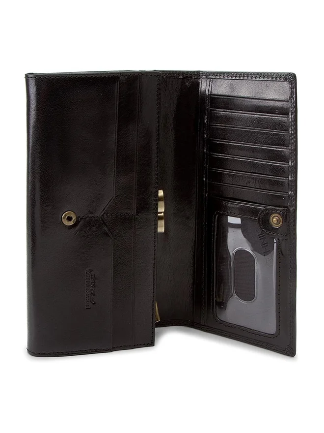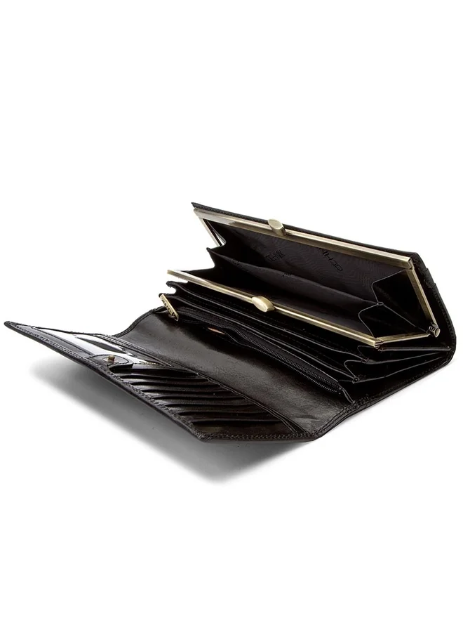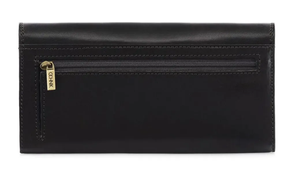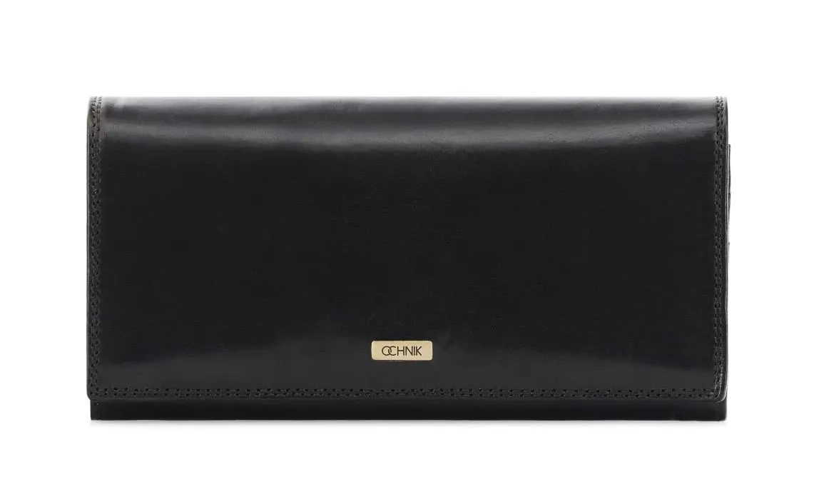 Luksusowy portfel damski OCHNIK wykonany z naturalnej skóry bydlęcej garbowanej roślinnie. Klasyczna czerń, elegancki bigiel i przemyślane wnętrze na karty, dokumenty i gotówkę.