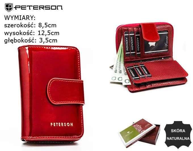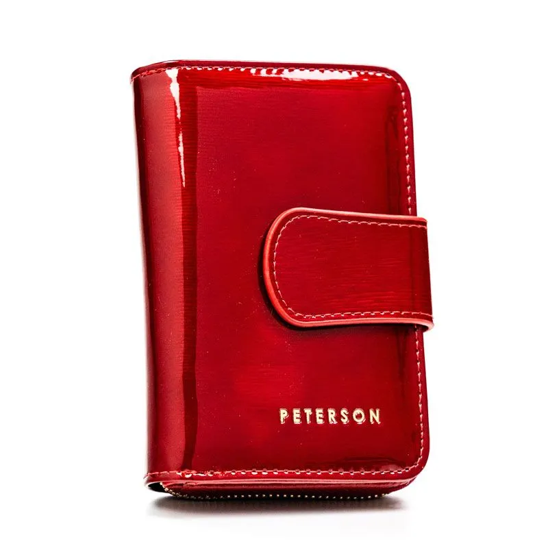 Elegancki portfel damski PETERSON® PTN 76115-SH wykonany został z naturalnej skóry, wykończonej w efektownym, lakierowanym czerwonym kolorze ze złotymi akcentami. To połączenie klasyki i nowoczesnego stylu, które doskonale sprawdzi się na co dzień oraz jako wyjątkowy dodatek.