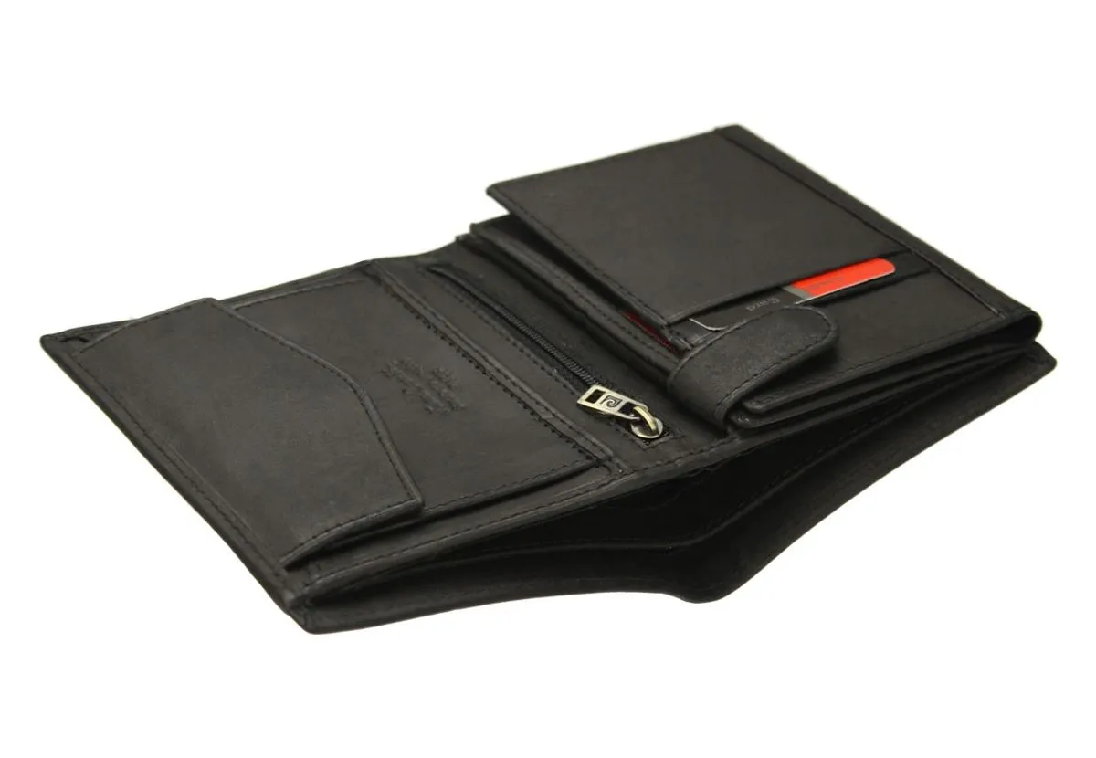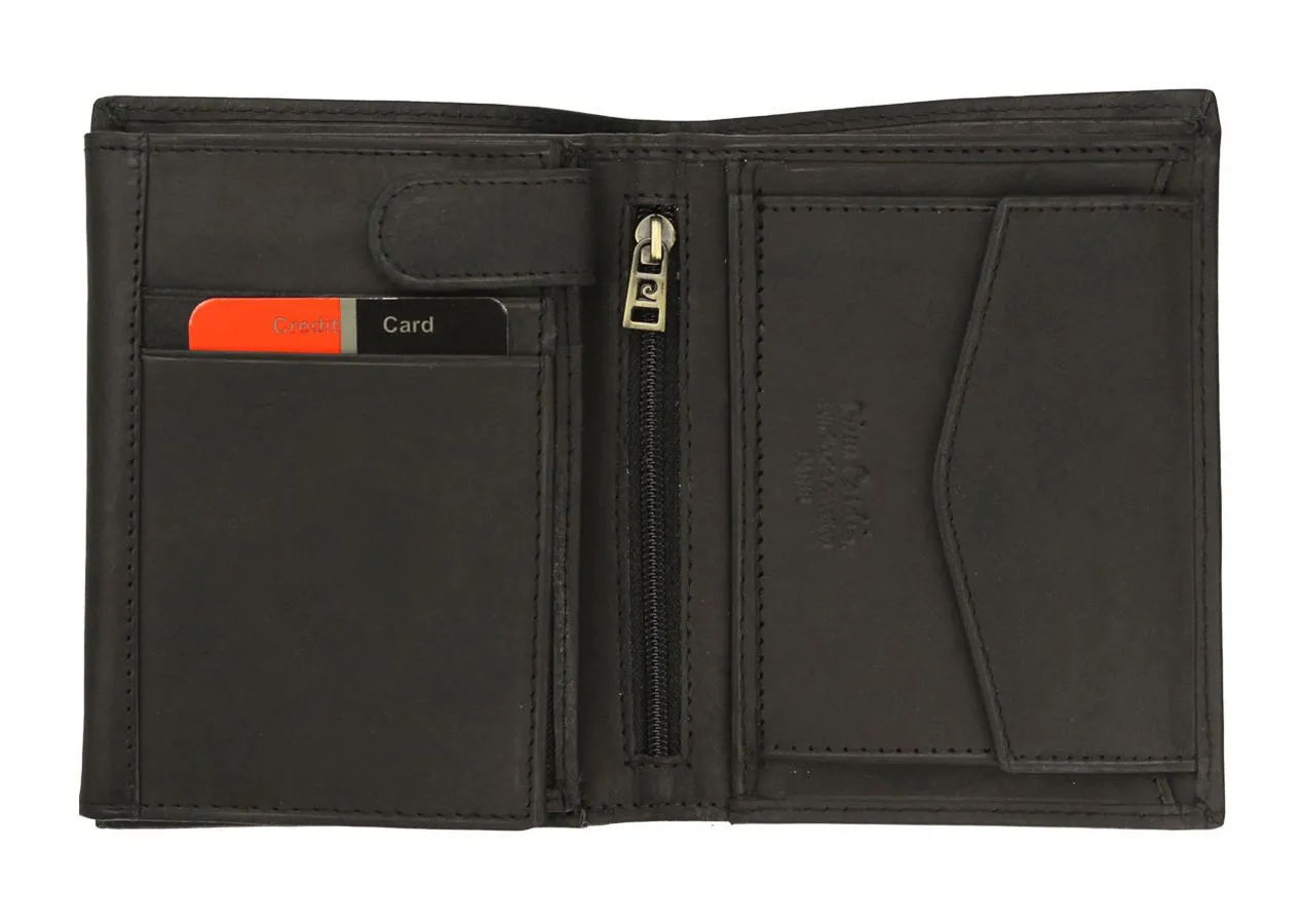 Portfel męski Pierre Cardin 326 MAR to propozycja dla mężczyzny, który wybiera jakość zamiast chwilowych trendów. Wykonany z wysokogatunkowej, naturalnej włoskiej skóry w wykończeniu matowy nubuk szlifowany, zachwyca subtelną fakturą i eleganckim, głębokim czarnym kolorem.
