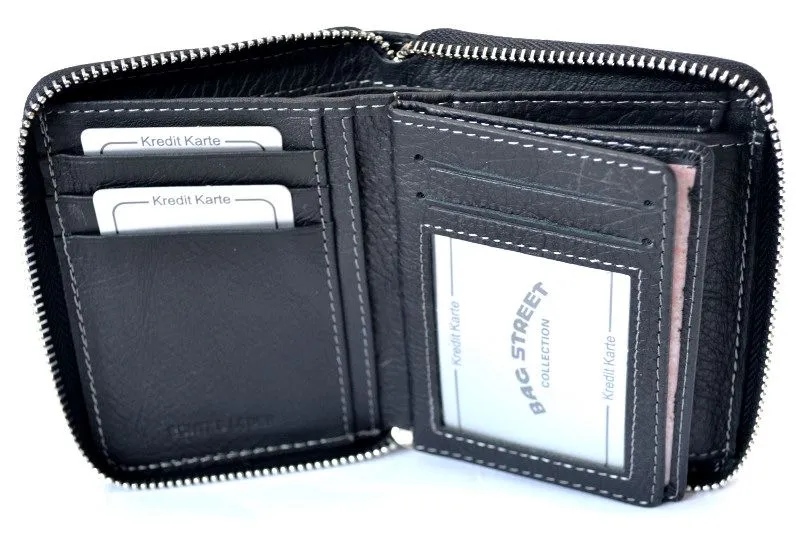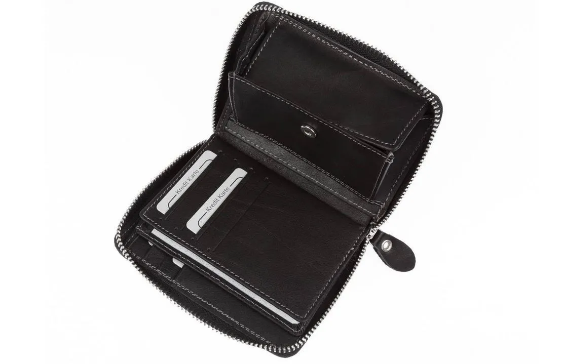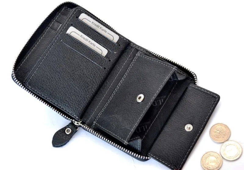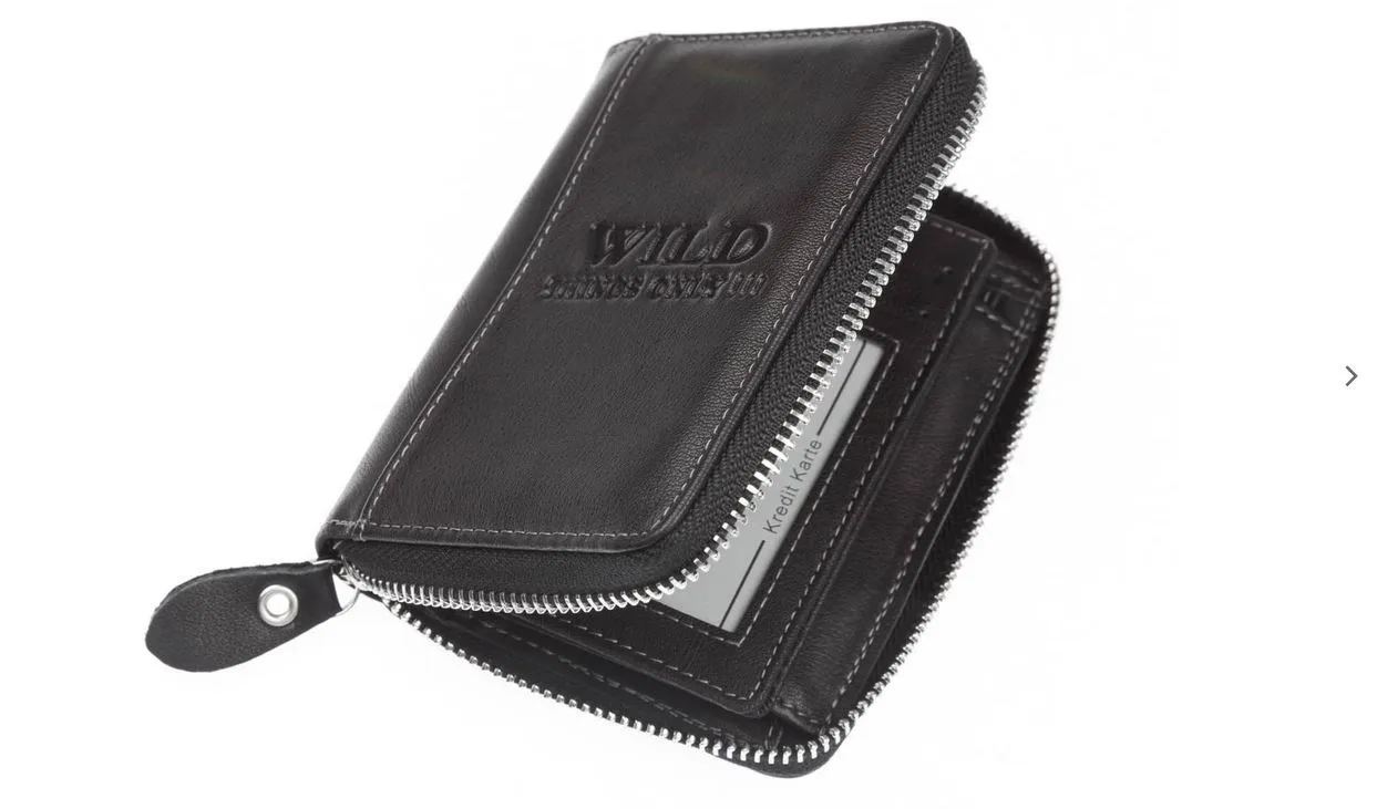 Skórzany portfel WILD 708 w kolorze czarnym to połączenie ponadczasowego stylu i nowoczesnego bezpieczeństwa. Wykonany z naturalnej skóry, zapinany na solidny suwak, wyposażony w praktyczny układ kieszeni oraz system RFID chroniący karty przed nieautoryzowanym odczytem.