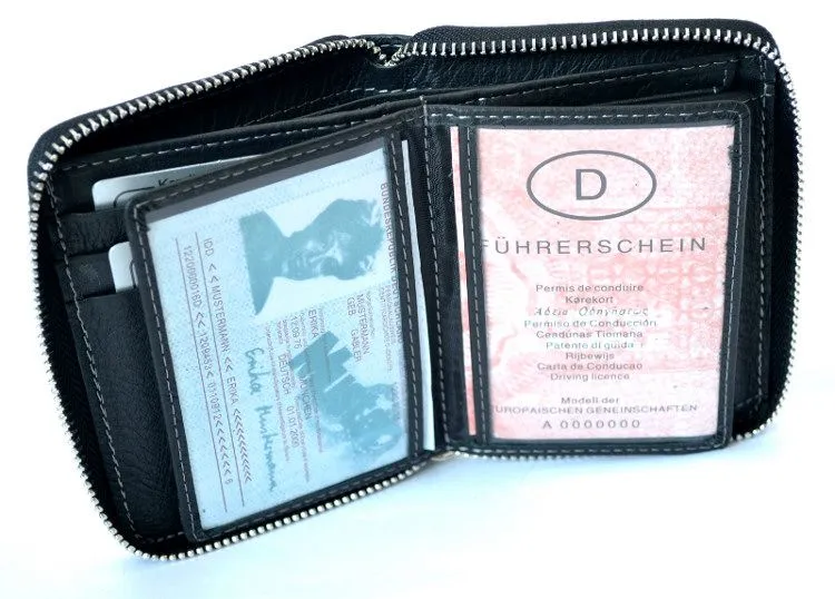 Model 708 to czarny portfel skórzany zapinany na solidny suwak, który zabezpiecza całą zawartość. Wszystko pozostaje na swoim miejscu – bez ryzyka przypadkowego otwarcia.