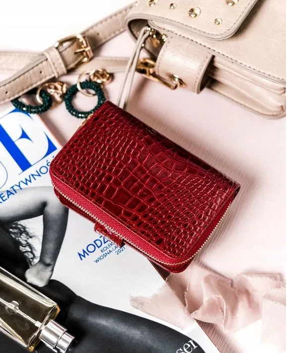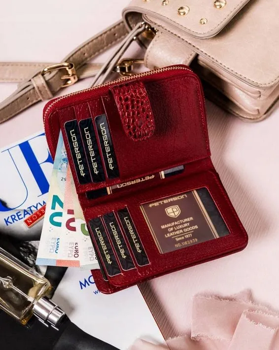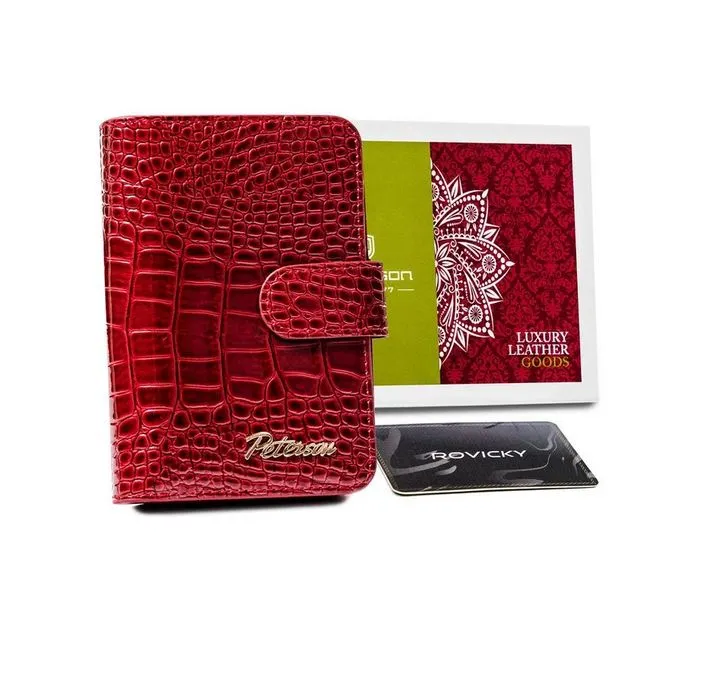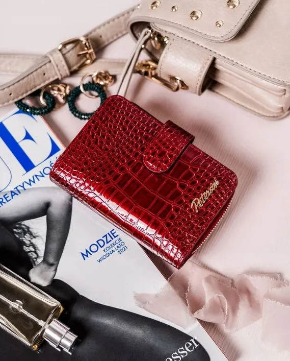 PETERSON CR-602 to portfel, który od razu robi wrażenie – intensywna czerwień, połyskująca lakierowana skóra i efektowne tłoczenie krokodyla sprawiają, że prezentuje się wyjątkowo elegancko i luksusowo.