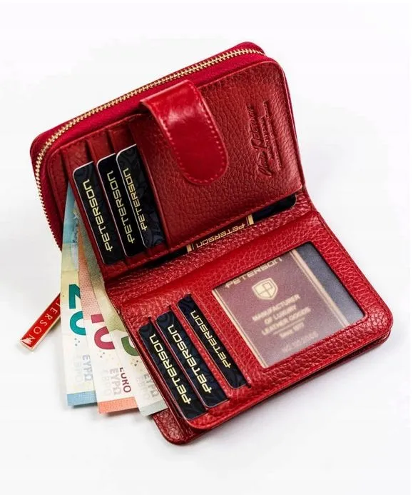 The PETERSON CR 602 is an elegant women’s wallet made from red patent leather. It combines a striking lacquered look with a functional interior and RFID protection, ensuring security for cards and documents in everyday use.