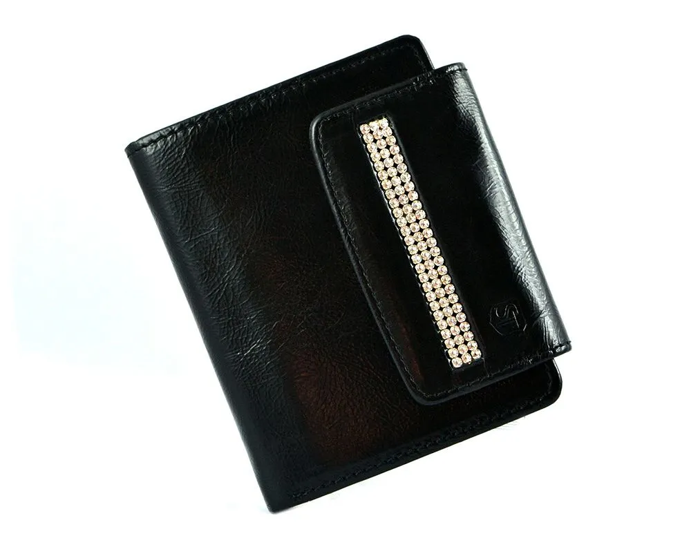 Ekskluzywny portfel damski z lakierowanej skóry naturalnej ozdobiony autentycznymi kryształami Swarovski® (szlif XILION). Klasyczna czerń, ochrona RFID i elegancka drewniana szkatułka w zestawie.