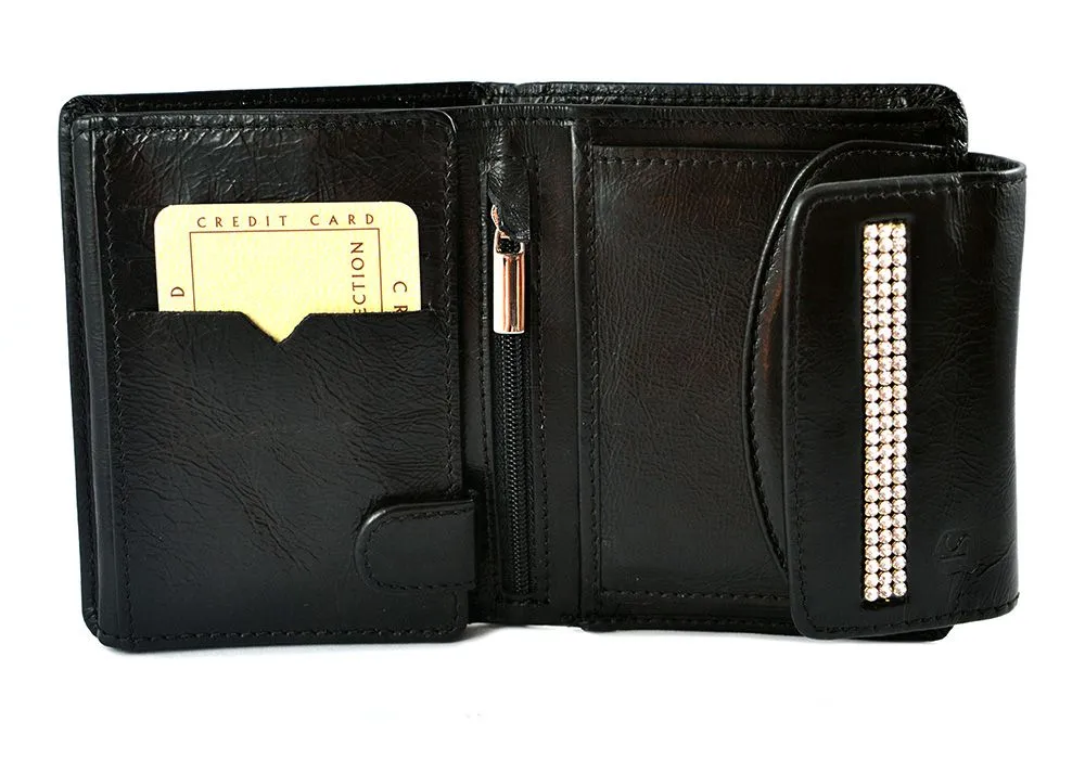 Czarny portfel wykonany z wysokiej jakości skóry lakierowanej, zdobiony oryginalnymi kryształami Swarovski®. Model łączy luksusowy design z funkcjonalnością – posiada przemyślane wnętrze oraz ochronę RFID zabezpieczającą karty przed nieautoryzowanym odczytem danych. Zapakowany w elegancką drewnianą szkatułkę, idealnie sprawdzi się jako wyjątkowy prezent.