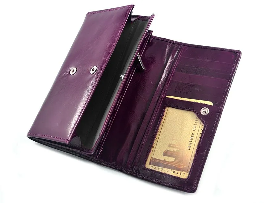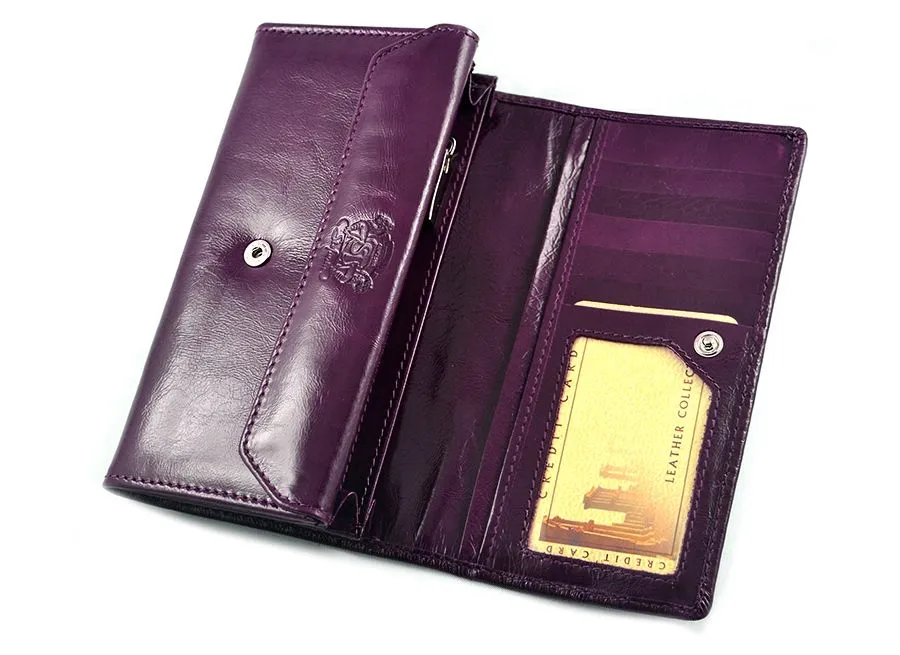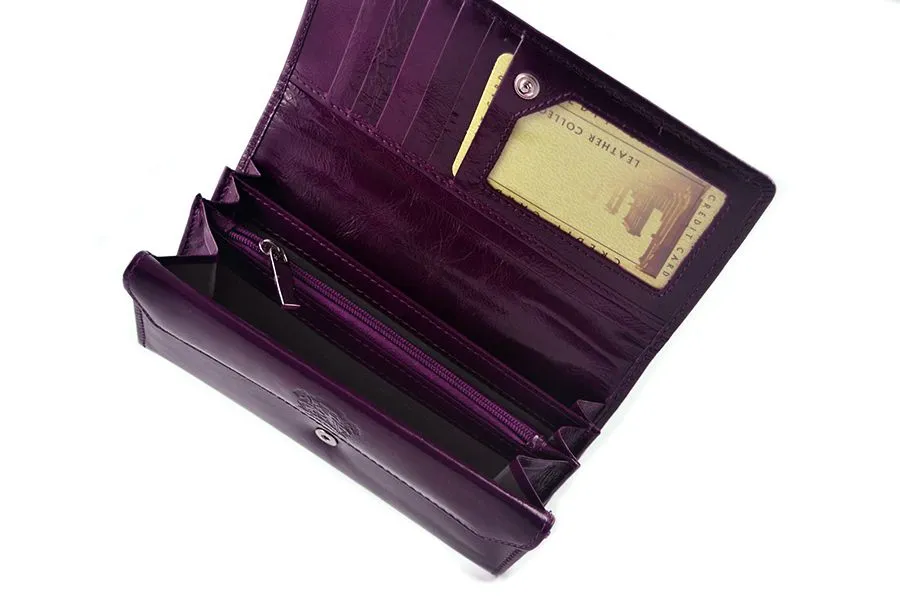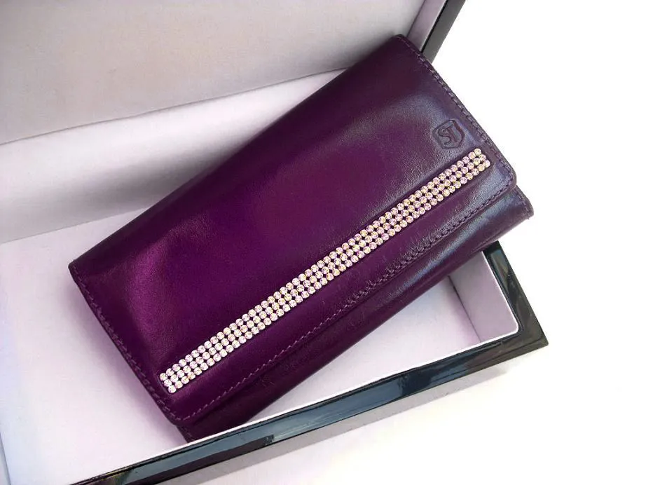Model SV-070 w głębokim, eleganckim fiolecie to ekskluzywny portfel damski wykonany z naturalnej skóry lakierowanej i ozdobiony aż 183 autentycznymi kryształami Swarovski®. To połączenie luksusu, funkcjonalności i kobiecej siły charakteru.